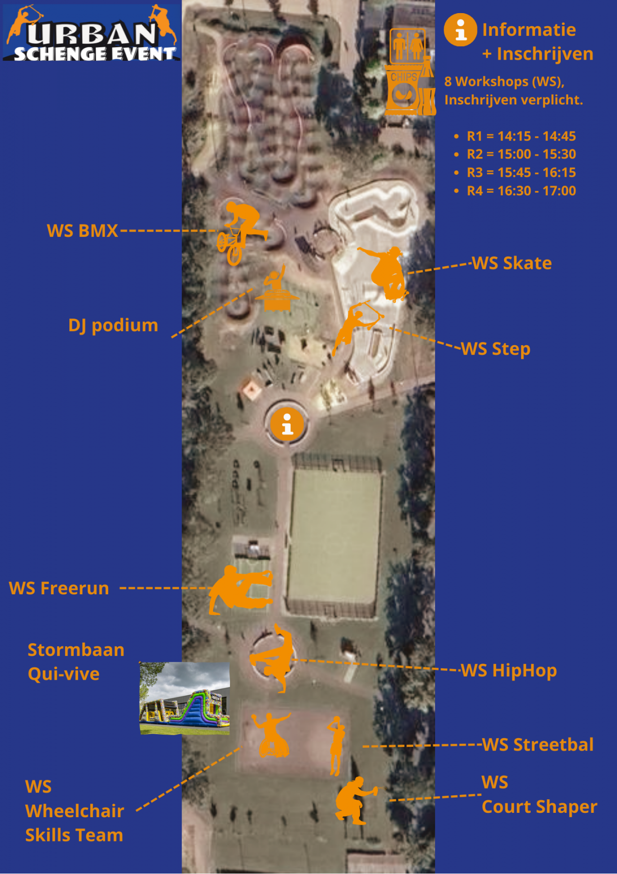Bij mooi weer wordt het Urban Schenge Event gehouden op het Urban Sportpark op Sportpark Het Schenge, Geldeloozepad 5D. Bij slecht weer wordt het evenement gehouden in het Omnium, Zwembadweg 3. Let op: tijdens het evenement kunnen er foto's en video's gemaakt worden. Meer informatie of vragen over het evenement? Neem dan contact op met Joeri van Wallenburg via 06-46594866.